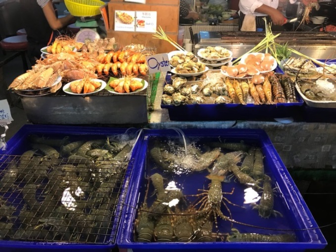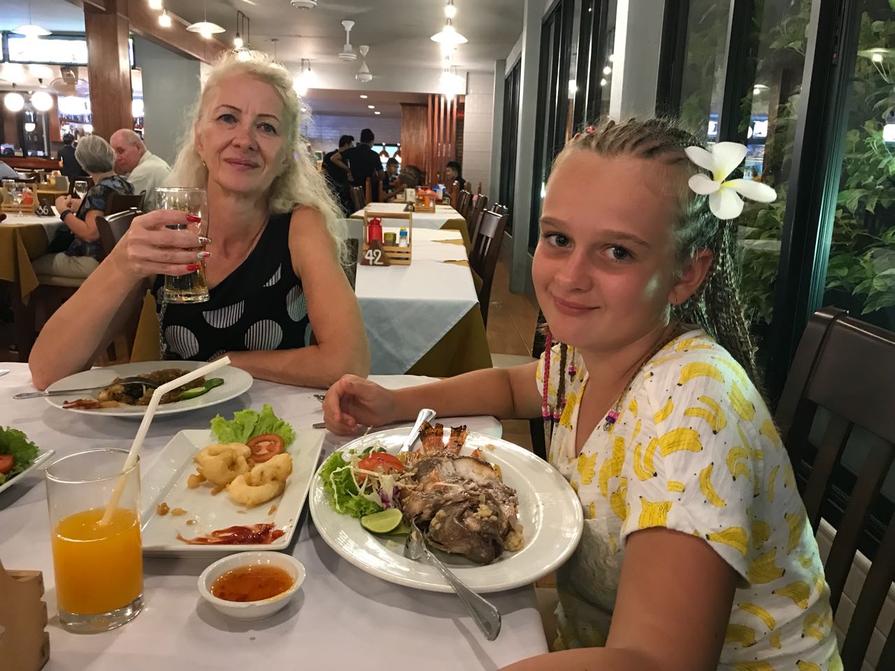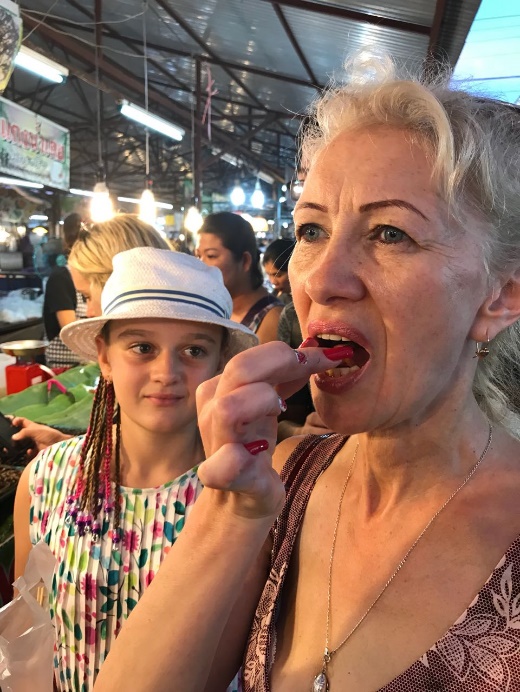 Петровы бродили по рынку сами по себе, Игорь их сопровождал. С чемоданом и вещами мы нашли их в той части рынка, где еда. Аня пила пиво с креветками, а Нюшка ела рыбу, запеченную на мангале. Мы присоединились к трапезе, заказав себе тоже рыбу.