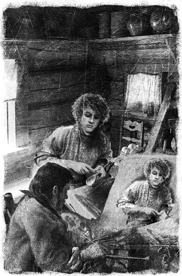 Глубокий вечер, за окном луна…Расправил мрак плащ тёмный над землёю.Настало время сказок. Вам сейчасПридётся вновь постранствовать со мною.Мы посещали много разных мест.Сегодня же окажемся в деревне,Что сделали известной мастера,Которых звали прежде древоделы.Ремёсел много славных на РусиСебя в живых легендах закрепили.Но есть такие, о которых мыНесправедливо, кажется, забыли.Труд мастеров о ком пойдёт рассказ,Как раньше, так и впредь будет цениться.Умелец, что работает с душой,Всегда сумеет ярко проявиться.Итак, представьте сказочный рассвет…Будя хозяев, петухи запели,Зашевелилась с нежностью листва,Люд начал покидать свои постели…В деревне наступал обычный день,Наполненный работой и заботой.Озвучивал окрестность громко скот,На пастбище идущий с неохотой.А в двух больших бревенчатых домахВ то время ожидалось прибавленье.И данные события легли,В рассказе, как существенные звенья.Всё разрешилось, к счастью, как должно.Преподнесли тем временем подаркомВ одной семье жена супругу дочь,В другой – богатыря с «копною» яркой.Да, да… Он от рожденья рыжим был.То красоту его не уменьшало.В роду его прибавилось мужчин,Что счастьем небывалым в доме стало.Случилось так, что каждая семьяЖелаемое в руки получилоНаградою великой за любовь,И временные муки облегчило.Мальчонке дали имя Серафим,За кудри ярко-огненного цвета.Девчушку предки Ольгой нарекли,Ведь в их дому прибавилось с ней света.Жизнь малышей до времени былаСчастливою, весёлой, беззаботной.И до пяти лет каждого в семьеНе занимали важною работой,Хотя в домах тех жили мастераИ тонких, кружевных дел мастерицы.Детишки познавали внешний мир.Они играли, слушали песнь птицы,Смотрели на красивые цветы,Закатом и рассветом любовались…При сборе ягод спелых и грибов,Их души благодатью наполнялись.Природа им давала посмотретьНа дивные пейзажные картиныЛесов, реки глубокой и полей,Узоры на стекле зимою длинной,Сияние сугробов серебромВ морозное и солнечное утро…Растущим помогали осознатьКак мир чудесен, поступая мудро.Заложен в этом был глубокий смысл.Увиденное чудо сохранялось,И всё, чем так прекрасен дивный мир,В дальнейшем в их работах отражалось.И даже безобидная игра,Дарующая счастье и веселье,В дальнейшем помогала воссоздатьПредметы, что достойны восхищенья,Закладывала в творчество настрой,Что в душах породить сумеет благость.Скажу вам, настоящим мастерамПриносит это истинную радость.К пяти годам, рождённые тогда,Конечно друг о друге уже знали.Им нравилось носиться, веселясь,По улице с другими малышами.Но вскоре время беззаботных игрСменилось полосою обученья,Когда удача в маленьких делах,Как праздник поднимало настроенье.Девчушка вышивала и плелаНевиданные, тонкие узорыИ нежною пригожестью своейЛаскала устремлённые к ней взоры.А в восемь лет подросший СерафимТопор в руках держал довольно крепко.Он с лёгкостью умел колоть дрова,Для розжига печи снабжал всех щепкой.Конечно, погруженье в ремеслоСвершалось, безусловно, под приглядом.Осваивая острый инструментПро безопасность забывать не надо.Парнишку брать старались чаще в лес.Он должен был познать виды деревьев,Прислушиваясь, впитывать в себяВсё познанное в прошлых поколеньях.Теперь он ведал – дерево неслоВнутри себя магические силы,И в дом, что был построен из негоДыхание живое привносило.Скажу вам боль