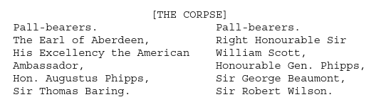 And the private mourners of the deceased, consisting of-Aldermen Wood and Birch, Rev. – Est, Rev. Holt Oakes, Henry Bankes, Esq. M.P., William Smith, Esq. M.P., Richard Hart Davies, Esq. M.P., George Watson Taylor, Esq. M.P., Jesse Watts Russell, Esq. M.P., Archibald Hamilton, Esq., Thomas Hope, Esq., Samuel Boddington, Esq., Richard Payne Knight, Esq., Thomas Lister Parker, Esq., George Hibbert, Esq., John Nash, Esq., John Edwards, Esq., Major Payne, Captain Henry Wolseley, Captain Francis Halliday, James St. Aubyn, Esq., Henry Sansom, Esq., – Magniac, Esq., George Sheddon, Esq., James Dunlop, Esq., Joseph Ward, Esq., N. Ogle, Esq., George Repton, Esq., William Wadd, Esq., Henry Woodthorpe, jun. Esq., Christ. Hodgson, Esq., – Cockerell, sen. Esq., – Cockerell, jun. Esq., Leigh Hunt, Esq., P. Turnerelli, Esq., J. Holloway, Esq., Charles Heath, Esq., Henry Eddridge, Esq., A. Robertson, Esq., W. J. Newton, Esq., John Taylor, Esq., T. Bonney, Esq., – Muss, Esq., – Martin, Esq., J. Green, Esq., John Gait, Esq., William Carey, Esq., – Leslie Esq., – Behnes, Esq., George Samuel, Esq., John Young, Esq., Christopher Pack, Esq., W, Delamotte, Esq., E. Scriven Esq., J. M. Davis, Esq., C. Smart, Esq., &c.