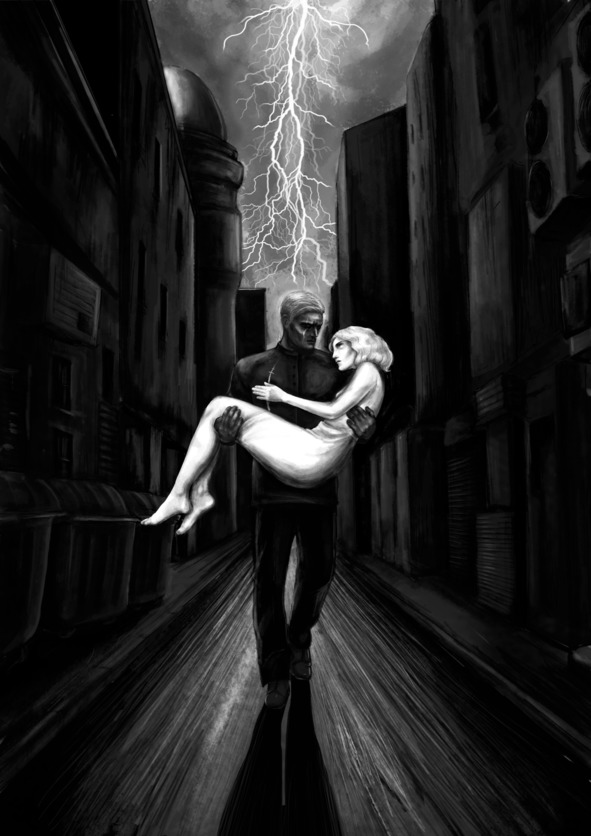 Гэвин с Вивьен на руках выходит через чёрный ход в пустой переулок рядом с театром.