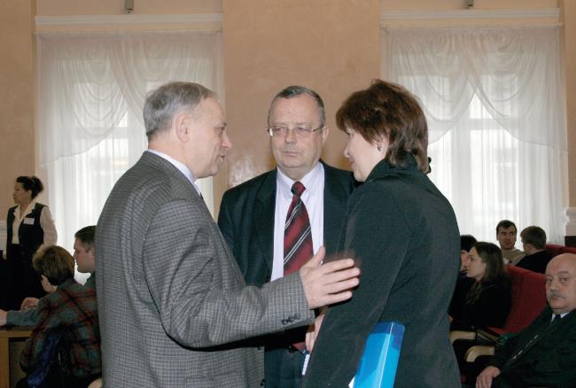 Всесоюзная научно-методическиая конфренция «Повышение качества высшего профессионального образования» в СФУ, 2008 г. (обсуждение вопросов конференции – К. К. Колин, И. А. Пфаненштиль, В. Б. Казанцева; в президиуме – С. А. Подлесный)
