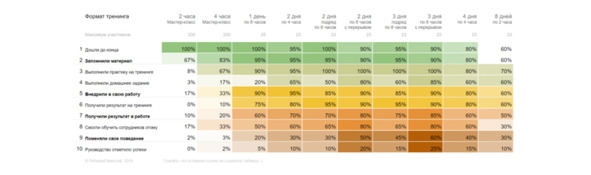 Я составил таблицу сравнения эффективности разных форматов очных тренингов.