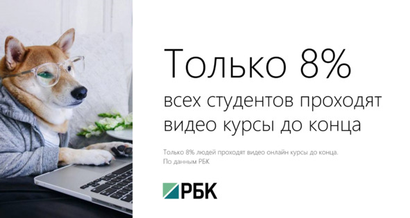 2. Видеокурсы неэффективны. Есть библиотека видеокурсов, но, в лучшем случае, один процент людей заходит в неё что-нибудь посмотреть и, может быть, еще полпроцента доходят эти курсы до конца. Видеокурсы без обратной связи и обычные двух часовые вебинары сами по себе не эффективны. По статистике РБК: только восемь процентов всех студентов видеокурсов проходят их до конца.