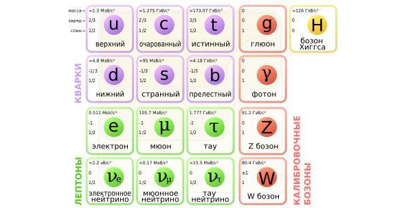 В 1964 году физики Мюррей Гелл-Манн и Джордж Цвейг показали, что тяжелые частицы – барионы состоят из трех более мелких частиц – кварков с дробным зарядом по отношению к заряду электрона, а частицы с помежуточными массами – мезоны состоят из пар кварк-антикварк. Так была заложена первая классификация элементарных частиц в рамках квантовой хромодинамики, поскольку кваркам было приписано свойство, называемое цветностью. Позднее всего было обнаружено 6 кварков (up, down, top, bottom, charm, strange). К середине 70-х годов прошлого столетия была построена так называемая стандартная модель из «истинно элементарных» частиц, которая включает 12 частиц материи – фермионов с полуцелым спином (6 кварков и 6 лептонов – электрон, мю мезон, тау мезон и 3 соответствующих им нейтрино – электронное, мюонное и тау-нейтрино), а также 4 частицы переносчики фундаментальных взаимодействий – бозонов с целым спином (гравитон, фотон, 8 глюонов и комплекс из W+, W- и Z0 бозонов).