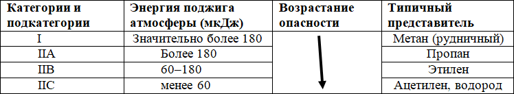 Как было выше сказано, существуют категория I и три подкатегории категории II: IIA, IIB, IIC. Для категории II каждая последующая подкатегория по опасности воспламенения включает предшествующую, то есть, подкатегория С является высшей и включает требования всех категорий – А, В и С. Она, таким образом, является самой «строгой». Это можно увидеть в нижепредставленной табл. 1.1.