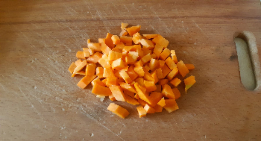 3. Нарезать баклажан. Обжарить баклажаны. Отложить. Нарезать лук. Обжарить лук. Нарезать чеснок. Добавить чеснок. Добавить мускатный орех. Жарить 2 минуты.