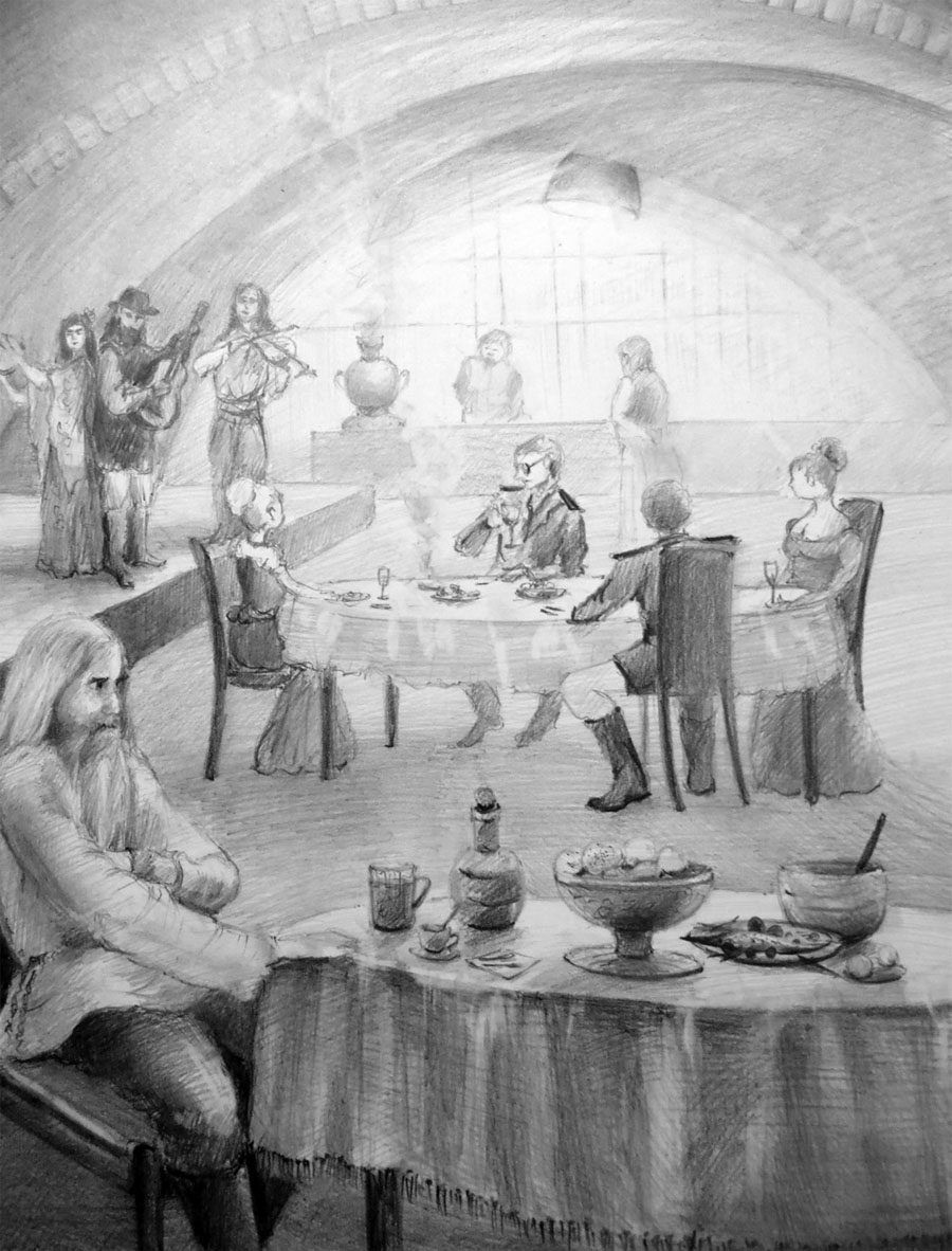 Сцена 2 (Санкт-Петербург. Цыганский кабак. Играет музыка, шум, веселье. Как только Распутин входит, наступает гробовая тишина.)