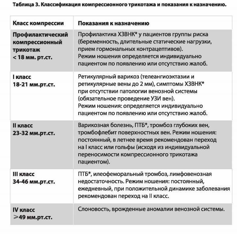 Учитывая важность создания дозированного давления на ткани, невозможно переоценить роль компрессионного трикотажа. Показана его высокая клиническая эффективность по сравнению с компрессионной терапией эластичными бинтами. Кроме этого, трикотаж увеличивает двигательную активность и повышает качество жизни пациентов. Современные, гипоаллергенные материалы, обеспечивают комфортное его ношение. Классификация трикотажа по степеням компрессии приведена в таблице 3.