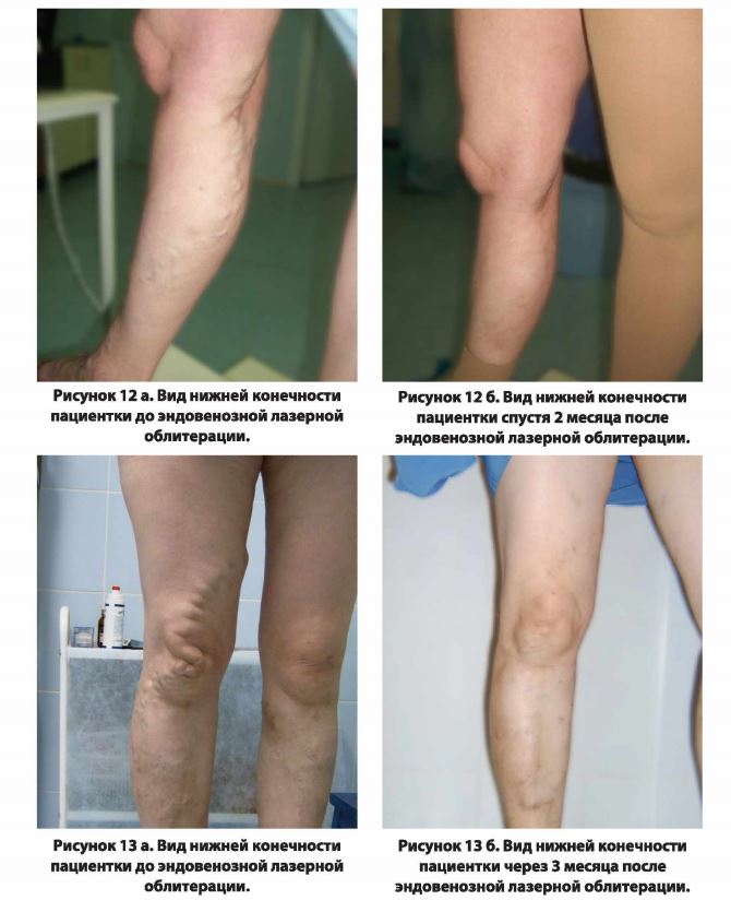 Метод эндовенозной лазерной облитерации отличается чрезвычайно малой травматичностью. Все манипуляции производятся через проколы кожи иглой под местной анестезией (т.е. без разрезов). Манипуляция занимает от 30 до 50 минут, после чего на пациента надевается компрессионный трикотаж. Активность и трудоспособность в послеоперационном периоде не страдают. Напротив, после вмешательства всем больным рекомендуется прогуляться в течение 30-40 минут. Общая длительность ношения компрессионного трикотажа, как правило, не превышает 2-х недель. Благодаря отсутствию необходимости выполнять разрезы, лазерная облитерация демонстрирует недостижимые ранее высокие косметические результаты (рис. 12,13).