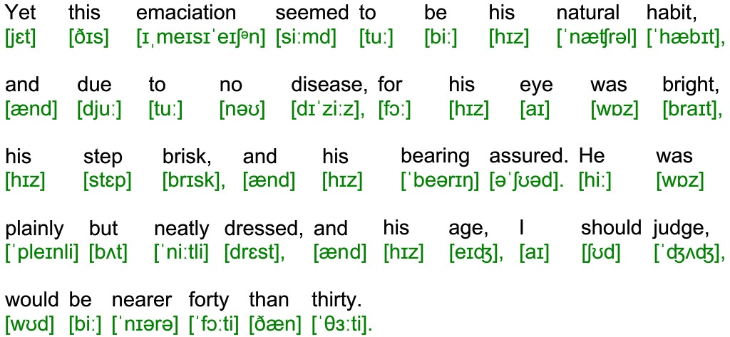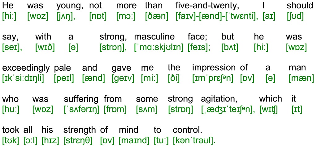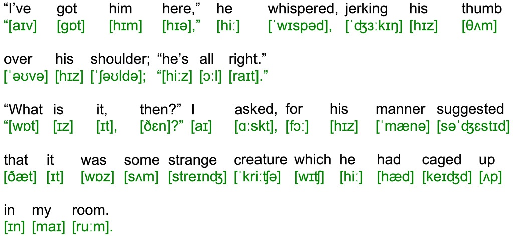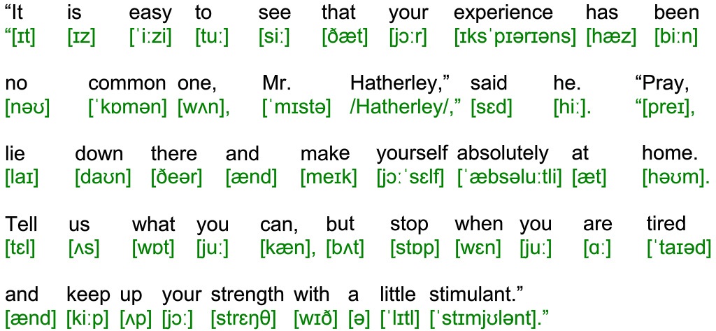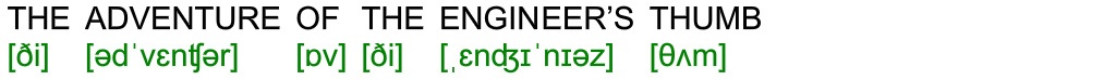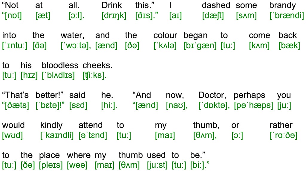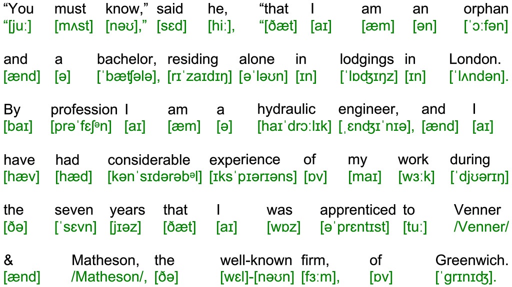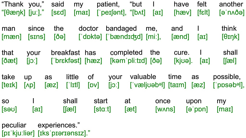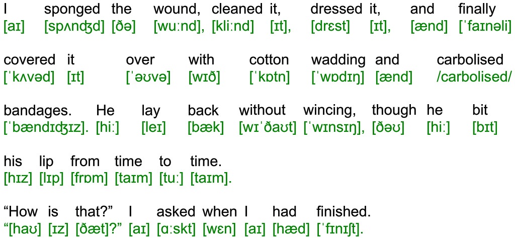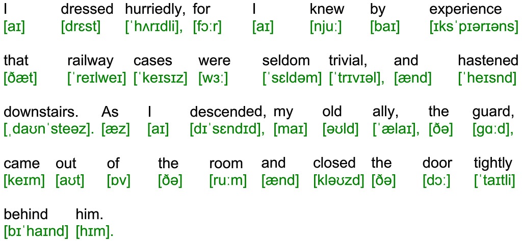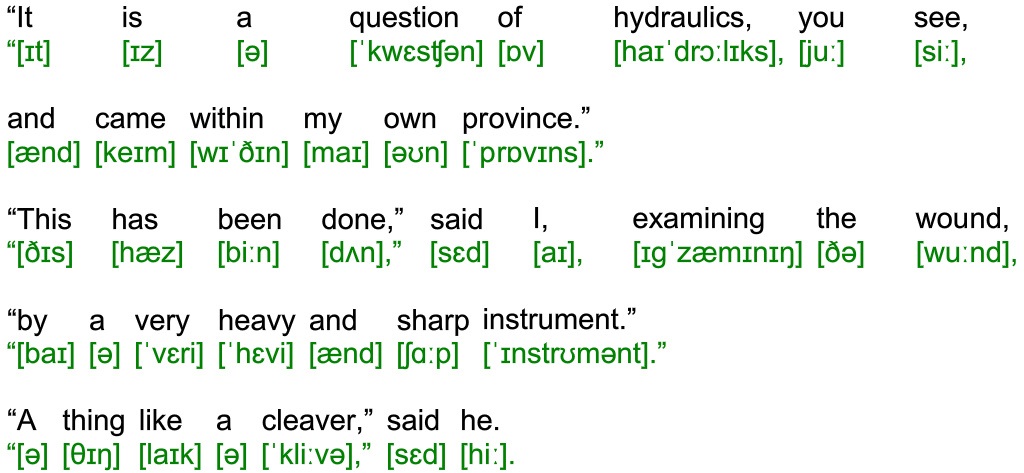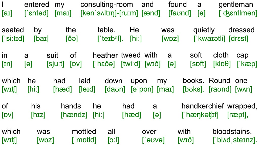 В данной книге приводится транскрипция текста рассказа А.К. Дойла «Палец инженера» на английском языке. Текст рассказа разбит на небольшие фрагменты. Фрагменты пронумерованы порядковыми номерами (01, 02,…,60). После номера фрагмента приведены время начала и окончания аудиозаписи текста фрагмента в аудиокниге. Для каждого фрагмента подготовлена транскрипция текста, оформленная в виде иллюстраций с изображением транскрипции текста фрагмента.