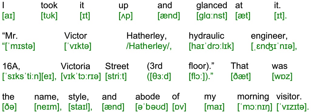 I took it up and glanced at it. “Mr. Victor Hatherley, hydraulic engineer, 16A, Victoria Street (3rd floor).” That was the name, style, and abode of my morning visitor. “I regret that I have kept you waiting,” said I, sitting down in my library-chair. “You are fresh from a night journey, I understand, which is in itself a monotonous occupation.”