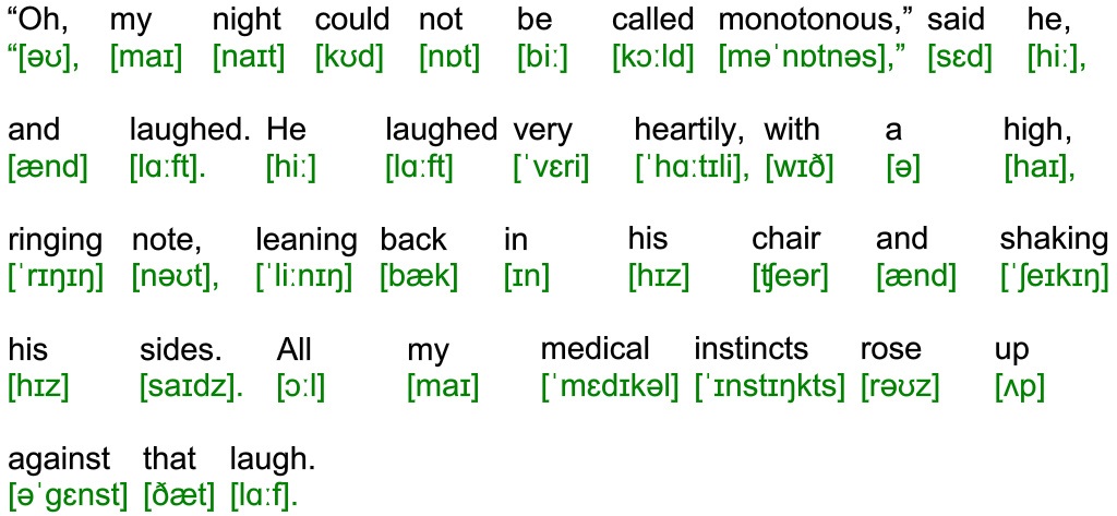 “Oh, my night could not be called monotonous,” said he, and laughed. He laughed very heartily, with a high, ringing note, leaning back in his chair and shaking his sides. All my medical instincts rose up against that laugh.