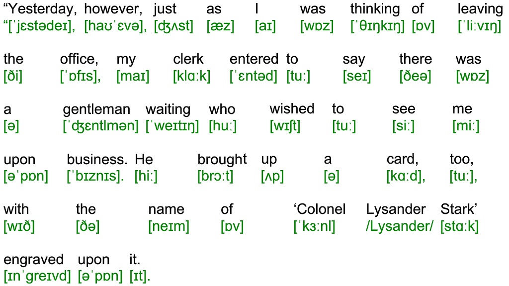 “Yesterday, however, just as I was thinking of leaving the office, my clerk entered to say there was a gentleman waiting who wished to see me upon business. He brought up a card, too, with the name of ‘Colonel Lysander Stark’ engraved upon it. Close at his heels came the colonel himself, a man rather over the middle size, but of an exceeding thinness. I do not think that I have ever seen so thin a man. His whole face sharpened away into nose and chin, and the skin of his cheeks was drawn quite tense over his outstanding bones. Yet this emaciation seemed to be his natural habit, and due to no disease, for his eye was bright, his step brisk, and his bearing assured. He was plainly but neatly dressed, and his age, I should judge, would be nearer forty than thirty.