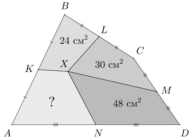 Задача 2Внутри четырёхугольника ABCD выбрана точка X. Точки K, L, M, N – середины сторон AB, BC, CD, AD соответственно. Оказалось, что площади четырехугольников BLXK, CMXL, DNXM равны соответственно 24, 30, 48 см². Найдите площадь четырехугольника AKXN.
