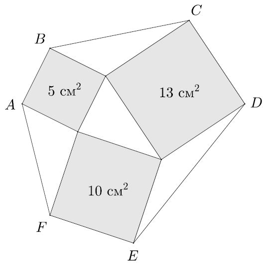 Задача 14Три квадрата, площадями 5, 10 и 13 см² попарно имеют общие вершины, как показано на рисунке. Вершины квадратов, не являющиеся общими, образуют шестиугольник ABCDEF. Найдите его площадь.