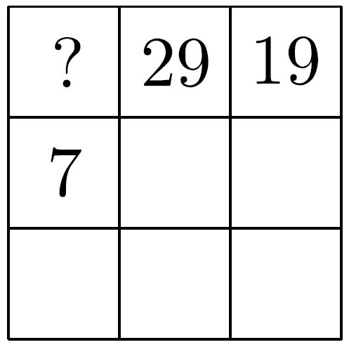 Задача 19В таблице 3x3 числа были расставлены так, что их суммы по всем строкам, столбцам и двум главным диагоналям равны. Затем часть чисел стёрли, как показано на рисунке. Найдите, чему равно число в левом верхнем углу таблицы.