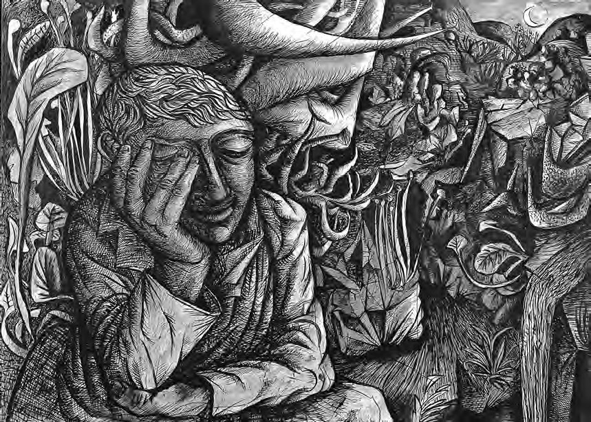 Творчество большинства перечисленных выше художников (кроме Фрейда) было отмечено тягостным сочетанием ностальгии и кошмара. Рисунок Кракстона тушью и мелом Спящий в пейзаже (1942) – одна из его ранних и самых памятных работ. Полумесяц заимствован у романтика девятнадцатого века Сэмюэла Палмера, к чьим работам тогда вновь пробудился интерес (Минтон шутил по поводу того, насколько полумесяц оказался «кстати» во время войны), в то время как угрожающе-колючие растения ближе к миру Герники Пикассо, чем к сельской идиллии.