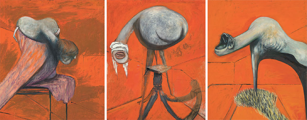 Посетители выставки были ошеломлены полотнами Бэкона. По словам Джона Рассела, те приводили людей «в полное оцепенение»[11]. Центральная фигура напоминала страуса без перьев, чья длинная, толстая, трубчатая шея заканчивалась не ловко забинтованным человеческим ртом. Как и его сотоварищи с обеих сторон, он казался загнанным в угол и готовым к нападению, «ждущим возможности стащить зрителя вниз, на свой уровень»[12]. Это бы ли «настолько беспросветно-ужасные образы, что при виде их мозг со щелчком схлопывался»[13]. Это было искусство, способное повергнуть зрителя в шок, но мимо него было трудно пройти. Кошмар не просто таился в пейзаже, незримый, как в работах неоромантиков: он был здесь, огромный и ужасный, он надвигался на вас.