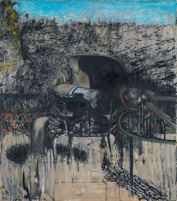 Джон Кракстон так отзывался о студии на Кромвель-плейс: «По правде говоря, чудесная». Он выбрал одну деталь, которая символизировала смесь роскоши и убожества, характерную для Бэкона как художника и человека: «У Фрэнсиса на полу лежал огромный турецкий ковер, и он был весь заляпан краской». Кэтлин Сазерленд, которая вместе с мужем Грэмом обедала там примерно раз в неделю, вспоминает, что «салатница была вымазана краской, а на картине красовалась салатная заправка» (но «еда и вино были превосходны, а разговоры чудесны»)[15]. Действительно, квартира и мебель сливались с краской и vice versa[16]: то и другое соединилось в «Фигуре в пейзаже».