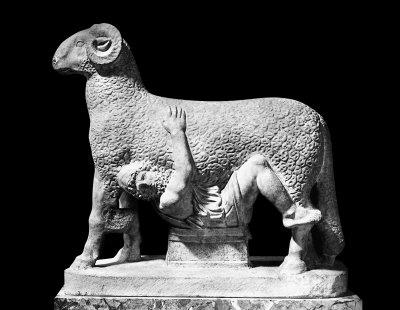 Всё шло по плану, но когда ослепленный и разгневанный циклоп наконец отвалил камень, выпуская голодных овец на пастбище, он по понятным причинам не намеревался отпустить покалечивших его людей. Он сел у входа в пещеру и стал ощупывать спины проходящих овец и пространство между ними, чтобы не дать сбежать ни одному человеку. Однако Одиссей предусмотрел это. Он привязал каждого своего товарища под брюхом трех овец, а сам примостился под самым крупным бараном. Именно этот эпизод запечатлен в римской статуе (ил. 10).