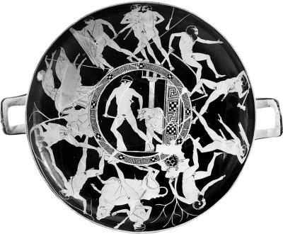 В центре краснофигурной чаши (ил. 11) Тесей изображен уже после своего триумфа над Минотавром, он вытаскивает убитого монстра из лабиринта, где тот был заточен. Центральное изображение обрамляют сцены, на которых предстают не только победы Тесея над разными безжалостными злодеями и чудовищами, но и способы, какими он их побеждал. А побеждал он преступников всякий раз их же уловками. Так (в верхней части), Тесей схватился с Керкионом, который заставлял странников бороться с ним до смерти. Далее по часовой стрелке (на два часа) он «подгоняет» тело Прокруста под размеры его ложа, отрубая выступающие конечности топором, как поступал с путниками и сам Прокруст. Еще ниже (на четыре часа) Тесей сбрасывает со скалы Скирона, отправляя его на съедение черепахе. Скирон развлекался тем, что принуждал путешественников мыть ему ноги на краю обрыва, а затем сталкивал их вниз – в качестве лакомства черепахи. В следующей сцене (на восемь часов, шесть часов пока пропускаем) Тесей расправляется с Синидом, привязав его к верхушкам двух пригнутых к земле деревьев, которые он потом отпустит, в точности так, как проделывал со своими жертвами Синид. В последнем сюжете (на десять часов) он убивает свинью, которая нападала на людей и уничтожала посевы в окрестностях Кроммиона.