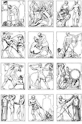 Некоторые противники Геракла весьма своеобразны и поэтому легко узнаваемы, как, например, многоголовая змееподобная гидра или трехтелый Герион. Другие изображаются по традиционной схеме – вепря Геракл, как правило, держит над собой, угрожающе нависая над спрятавшимся в бочке Эврисфеем, а поверженную лань герой обычно придавливает коленом. Но даже соперников и без каких-либо отличительных особенностей можно опознать, потому что они участвуют в историях, которые входят в цикл, иллюстрирующий подвиги Геракла. Таким образом, хотя оба героя, Геракл и Тесей, усмирили быка (ил. 11 и 12), никто, кроме Тесея, не может быть изображен на рисунке 11, находящемся в контексте других, несомненно Тесеевых деяний. И также несомненно, что только Геракл – герой на метопах в Олимпии. Однако не всегда так просто отличить одного персонажа от другого, когда оба орудуют палицей и оба участвуют в укрощении быка.
