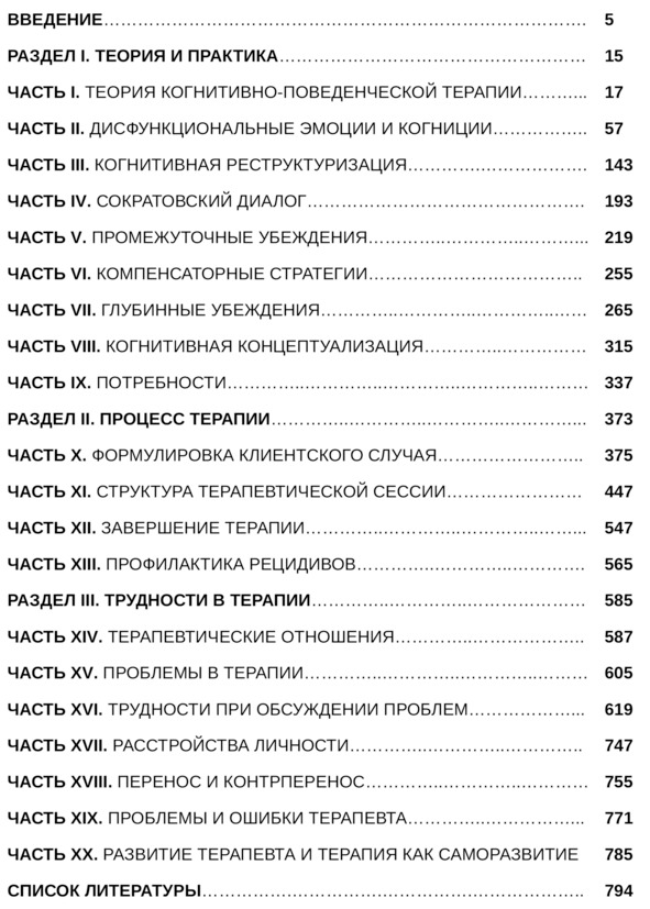 Во втором разделе «Процесс терапии» подробно рассматриваются разделы формулировки клиентского (клинического) случая, основные элементы вводной, основной и заключительной частей терапевтической сессии, а также специфика завершения терапии и профилактики рецидивов. Наконец, третий раздел «Трудности в терапии» посвящён описанию особенностей терапевтических отношений, специфики клиентского «сопротивления», разновидностей проблем в терапии и путей их решения, особенностей, критериев и признаков расстройств личности, проблем переноса и контрпереноса, а также дисфункциональных стратегий, иррациональных верований, ошибок и способов развития терапевта. Данное практическое пособие дополняется приложениями с необходимым для работы с клиентами инструментарием – бланком терапии, опросниками, объективными шкалами и бланком интервизии (супервизии), которые можно найти в отдельном небольшом издании «Когнитивно-поведенческая терапия. Рабочие бланки для специалистов».