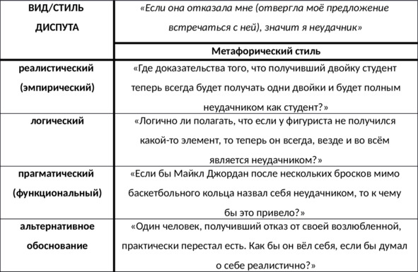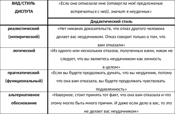 Если обобщить и структурировать вышеизложенную информацию о когнитивной реструктуризации искажённых и дисфункциональных автоматических мыслей (и иррациональных верований), можно выделить пять видов диспута, активно использующихся когнитивно-поведенческими терапевтами: