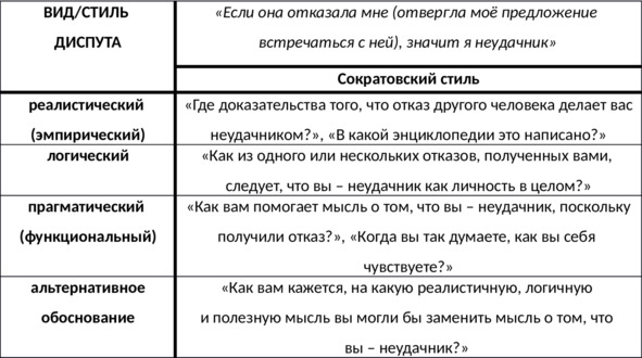 Кроме активного использования различных видов диспута когнитивно-поведенческие терапевты также применяют разнообразные стили диспутирования. Иными словами, реалистический (эмпирический), логический, прагматический (функциональный) виды диспута вкупе с ещё одним видом – альтернативным обоснованием – могут использоваться когнитивно-поведенческими терапевтами в дидактическом, сократовском54, метафорическом и юмористическом стилях. Таким образом, сочетание четырёх видов и квартета стилей диспута позволяет опытным специалистам помогать человеку оспаривать его автоматические искажённые и дисфункциональные мысли (и иррациональные верования) шестнадцатью возможными способами и находить индивидуальные ключи к особенностям мышления каждого человека (рис. 30).