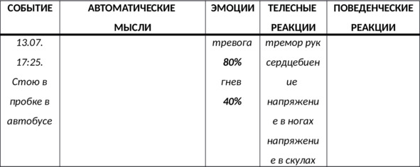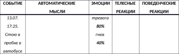 N.B. Не описывайте эмоции в колонке для автоматических мыслей: помните, что фраза «Я почувствовал тревогу» описывает эмоцию, которую стоит одним словом описать в колонке для фиксирования эмоций.
