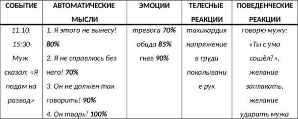 N.B. Важно выявлять первую автоматическую мысль, которая пронеслась в вашей голове за считанные доли секунды до возникновения той или иной эмоции: как правило, первые мысли – это оценка ситуации, которую вы можете раскрыть, задав себе вопрос: «Что для меня значит эта ситуация?»