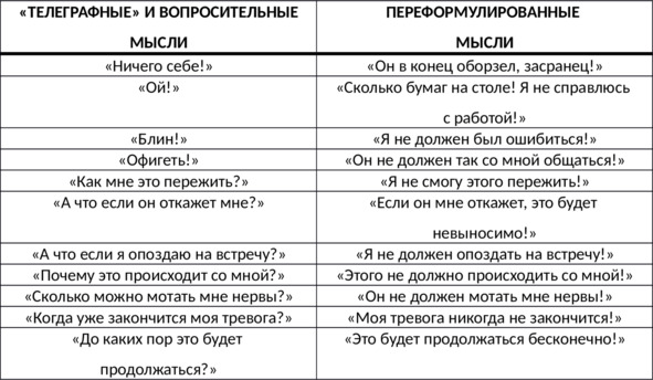 Нередко клиенты озвучивают так называемые «телеграфные» мысли (отдельные отрывочные мысли в виде слов, образов и их обрывков), которые терапевту важно помогать «разворачивать» в цельные и законченные предложения. Для этого терапевт может попросить клиента объяснить, что значит та или иная мысль, описываемая им в «телеграфном» стиле («Упс!», «Блин!», «Ничего себе!», «Офигеть!» и т.д.). При этом мысли, выраженные в форме вопросов, весьма часто являются свидетельством сильной тревоги. Если клиент высказывает мысль в вопросительной форме, терапевту стоит попросить его перевести её в утверждение или ответить на эту мысль-вопрос: «Как бы вы высказали эту мысль в виде утверждения, чтобы в конце стояла точка, а не вопросительный знак?» Примеры переформулированных «телеграфных» и вопросительных мыслей представлены в нижеследующей таблице (таб. 22).