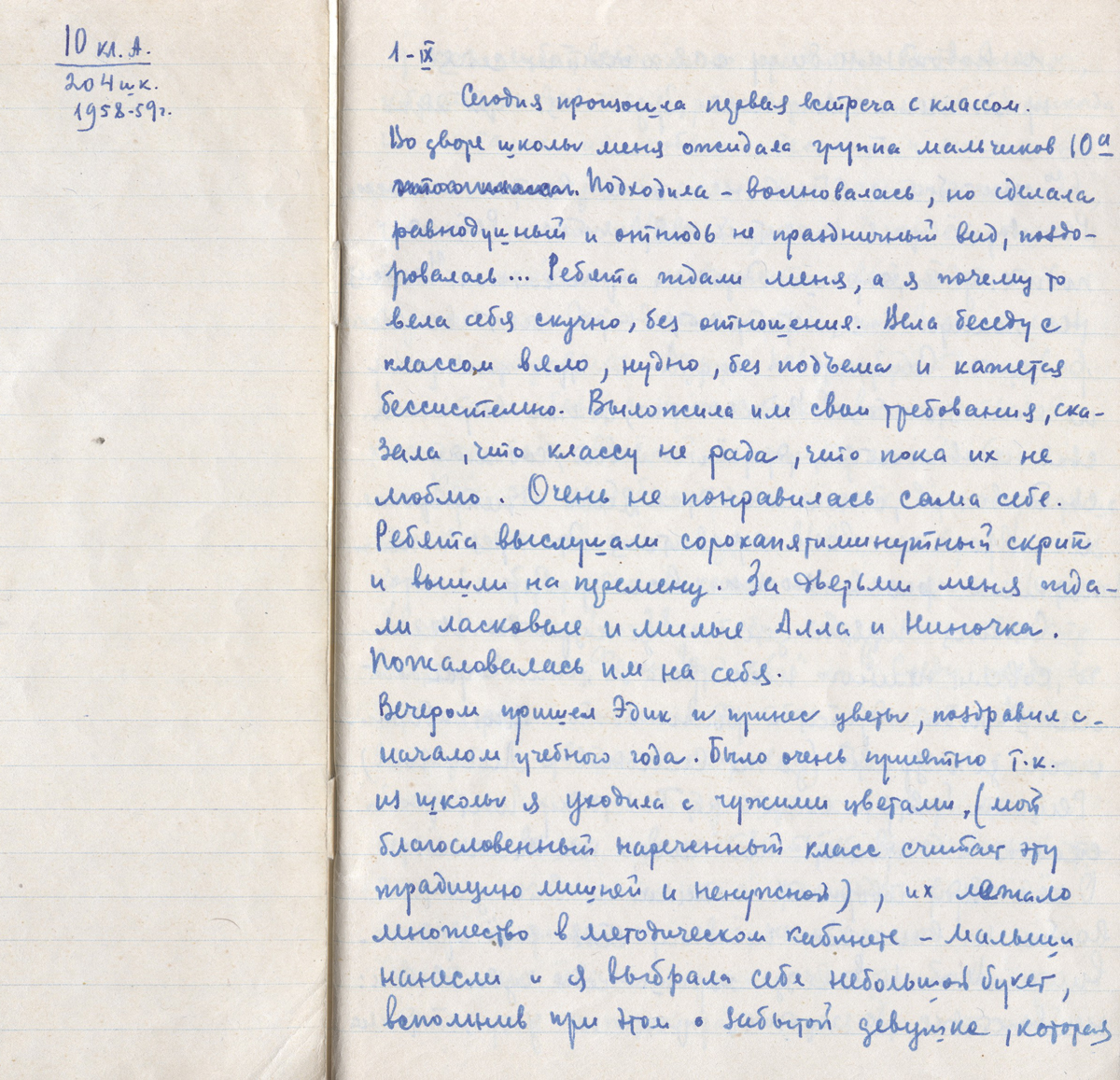 1 сентября 1958 годаСегодня произошла первая встреча с классом. Во дворе школы меня ожидала группа мальчиков 10 «А». Подходила – волновалась, но сделала равнодушный и отнюдь не праздничный вид, поздоровалась… Ребята ждали меня, а я почему-то вела себя скучно, без отношения. Вела беседу с классом вяло, нудно, без подъема и, кажется, бессистемно. Выложила им свои требования,