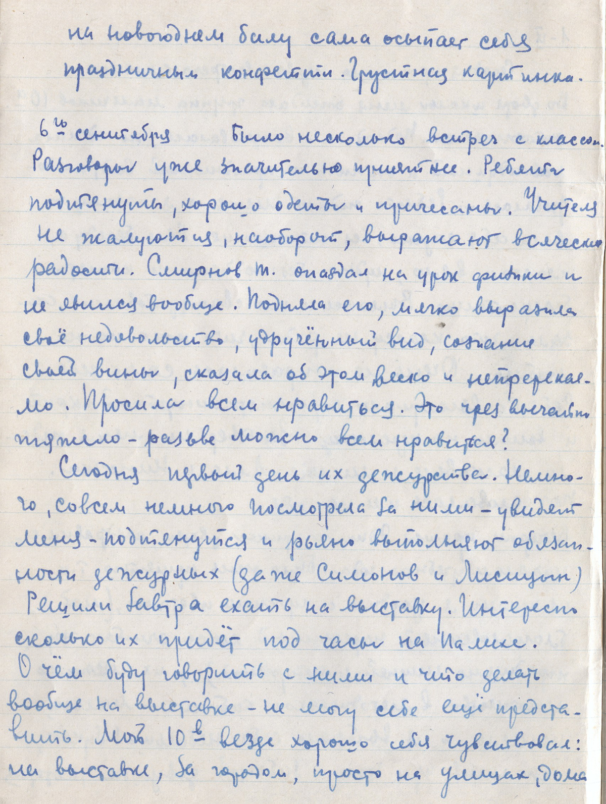 6 сентября 1958 годаБыло несколько встреч с классом. Разговоры уже значительно приятнее. Ребята подтянуты, хорошо одеты и причесаны. Учителя не жалуются, наоборот, выражают всяческие радости. Смирнов Т. опоздал на урок физики и не явился вообще. Подняла его, мягко выразила свое недовольство, удрученный вид, сознание своей вины, сказала об этом веско и непререкаемо. Просила всем нравиться.