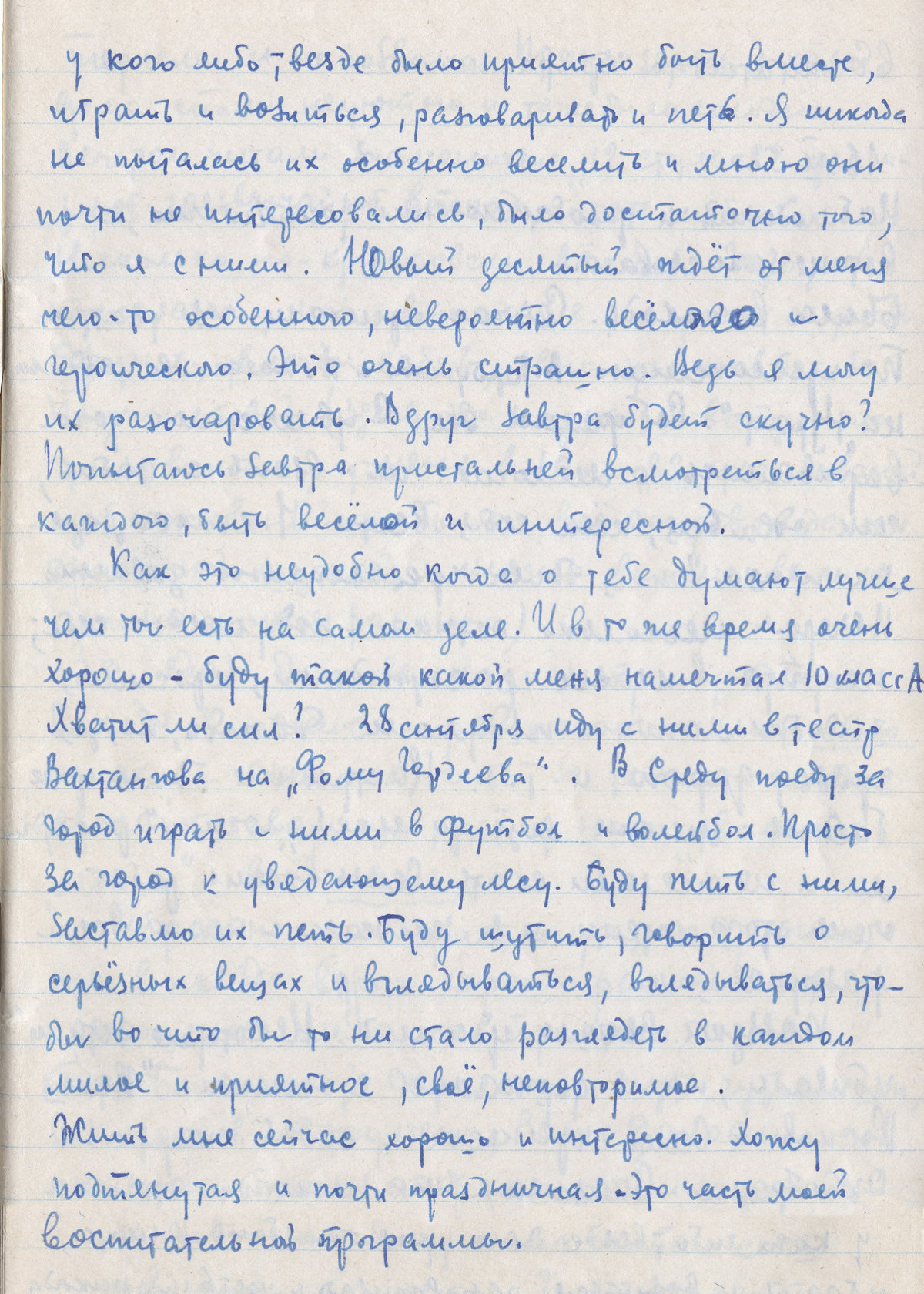 Как это неудобно, когда о тебе думают лучше, чем ты есть на самом деле. И в то же время очень хорошо – буду такой, какой меня намечтал 10 класс «А». Хватит ли сил? 28 сентября иду с ними в театр Вахтангова на «Фому Гордеева». В среду поеду за город играть с ними в футбол и волейбол. Просто загород к увядающему лесу. Буду петь с ними, заставлю их петь. Буду шутить, говорить о серьезных вещах