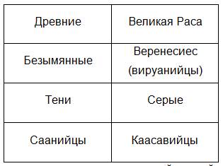 Старшие изначально учили несколько Рас. О трёх приближенных здесь уже было сказано. Но есть ещё три, которые так же сильно развиты, но развиваются обособленно своим путём, не выступая на стороне Древних и Великой Расы. Это Веренесиес (это древнейшая раса, и есть у них другое имя; они из тех, кто пошёл индивидуальным путём и не взял на себя ответственность за обучение рас). Безымянные (тоже одна из сильнейших рас, которая в начальных днях творения и развития лицезрела силу Старших и общалась с ними. О них можно сказать, что это своеобразный «Закрытый Монашеский Мир» в этой реальности). Серые, иначе Следящие за движением (к ним относятся существа и силы, которые находятся на таком уровне развития, где нет понятий добра и зла, а есть только Золотая Середина, за принципами которой они следят. Своеобразная раса, её еще можно назвать также особой «Инквизицией» этой реальности).