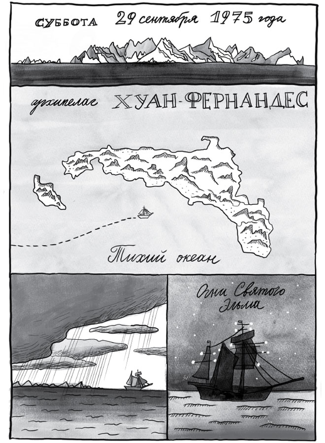 Однажды вечером 29 сентября 1759 года, около архипелага Хуан-Фернандес, что в шестистах километрах от берегов Чили, небо вдруг почернело. Экипаж «Виргинии» собрался на палубе, чтобы посмотреть на маленькие огоньки, вспыхивавшие на верхушках мачт и реях корабля. Это были огни святого Эльма, явление, вызванное атмосферным электричеством и предвещавшее жестокую бурю. К счастью, «Виргиния», на которой путешествовал Робинзон, могла не бояться самого страшного шторма. Это был голландский галиот, небольшой корабль с низкими мачтами, немного тяжелый и медлительный, но устойчивый в ненастье. Когда в тот вечер капитан ван Дейсел увидел, как один из парусов лопнул от порыва ветра, словно воздушный шарик, он тут же приказал команде убрать остальные и запереться внизу, пока буря не кончится. Единственное, чего стоило бояться, были рифы и песчаные отмели, но на карте они не значились. Казалось, «Виргиния» могла и дальше идти сквозь грозу сотни километров, ничего не страшась.