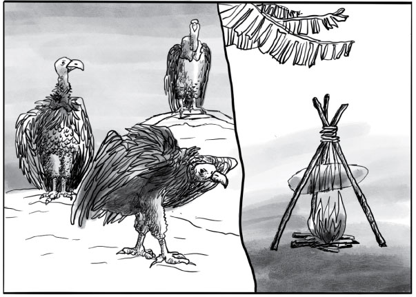 Робинзон питался моллюсками, корнями папоротника, кокосовыми орехами, ягодами, птичьими и черепашьими яйцами. На третий день он отшвырнул прочь кости козла, которые уже начинали гнить. Но вскоре об этом пожалел: стервятники, один раз получившие угощение, преследовали его и наблюдали за ним в ожидании новых подачек. Иногда, окончательно взбесившись, Робинзон кидался в них камнями и поленьями. Мрачные птицы нехотя отступали, но лишь для того, чтобы вскоре вернуться.