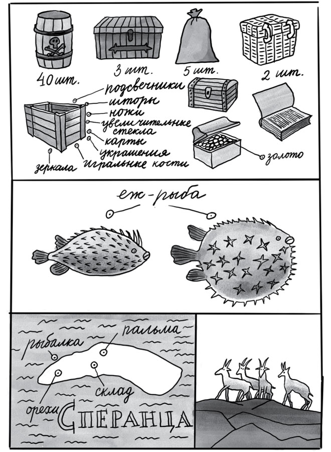 Такую жидкость он извлек из рыбы, водившейся около Восточной скалы. Это была еж-рыба, или Двузуб. У ежа-рыбы мощная нижняя челюсть, а все тело покрыто ядовитыми иглами. В случае опасности она набирает в себя воздух, надувается и становится круглой, как шар. Поскольку весь воздух собирается в ее животе, в эти моменты она спокойно плавает на спине. Как-то раз Робинзон пошевелил палкой одну из таких рыб, выброшенных на песок и заметил: все, что прикасалось к ее животу, окрашивалось в стойкий ярко-красный цвет, который прекрасно мог бы заменить чернила.