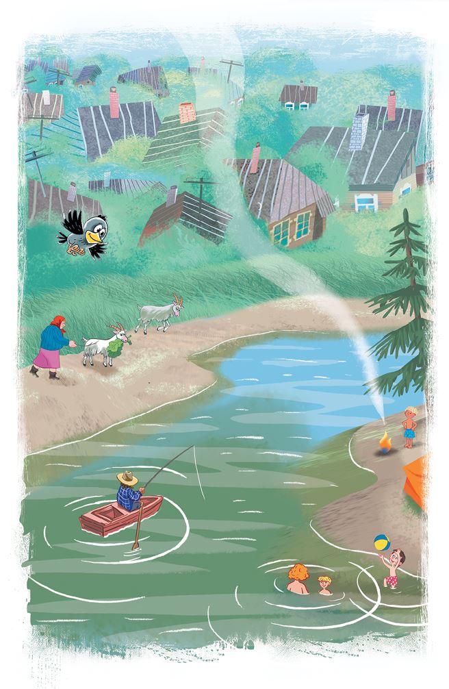 На другой день на Простоквашино тепло навалилось, жара настоящая. Весь народ к речке потянулся. Ещё только семь утра, а на речке люди уже плавают в воде, мячами кидаются.
