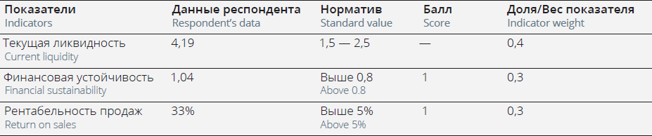 If the denominator in the Current Liquidity or Financial Sustainability indicators equals zero, it was decided that for social entrepreneurs these indicators can be counted as meeting the standard. A score of one is assigned on these indicators. It makes financial sense. If the current liquidity is within the standard value, this means that the company has no problems meeting its obligations (liabilities are paid-up and equal zero). The standard value of the Financial Sustainability ratio means the organization uses only its own funds in the capital structure, which translates to zero risk of default on loans.