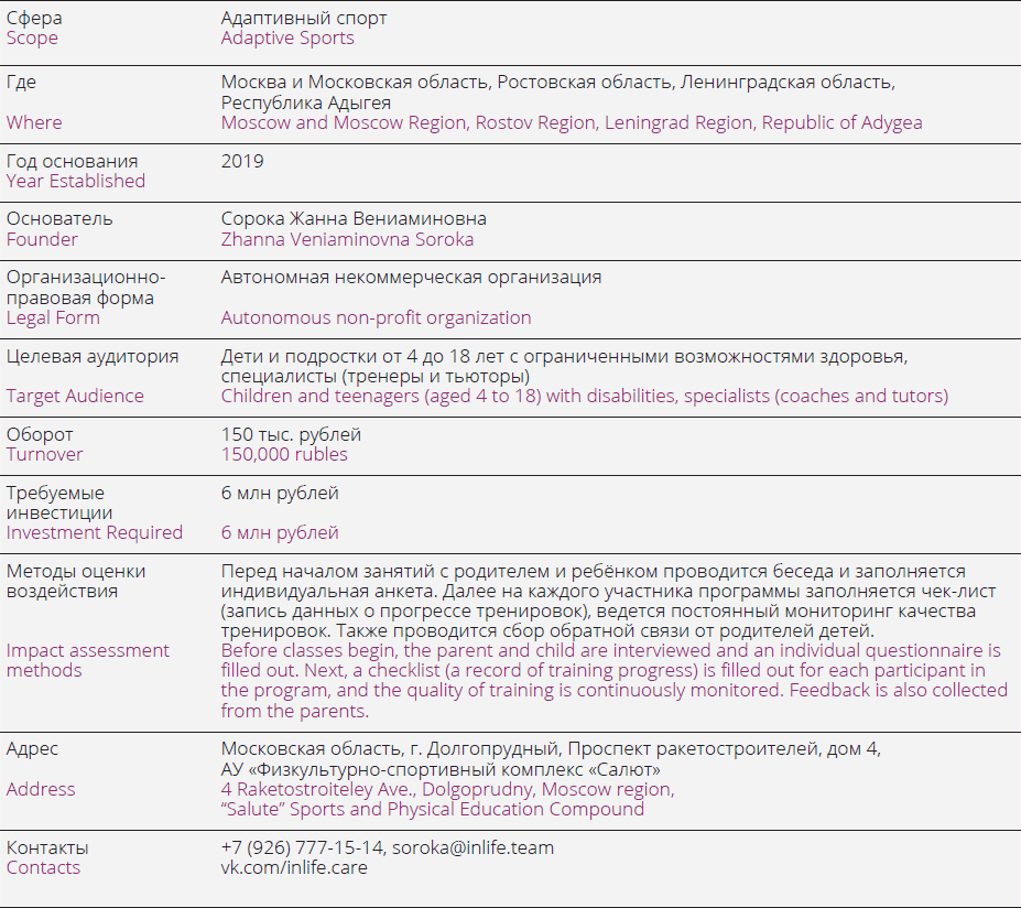 PROBLEM ADDRESSEDNumerous studies have proven that physical education and sports are the most important methods of successful socialization, rehabilitation and adaptation to adult life in children and adolescents with disabilities. However, not all regions of the Russian Federation allow children with disabilities to attend sports sections or therapeutic physical education classes. The reasons are varied: from lack of specialists and infrastructure and low financial status of the parents of children with disabilities, to insufficient awareness among parents about the possibility of receiving habilitation assistance. A survey of parents, conducted by the INLIFE Adaptive Sports Center, showed that 95.7 % address the problem of their child’s rehabilitation on their own. At the same time, 100 % of parents are interested in receiving assistance from the state.