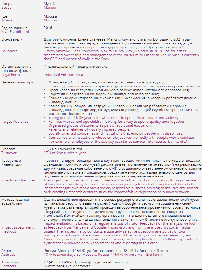 METHODS USED TO ADDRESS THE PROBLEMDevelopment of unconventional guided tours and other original programs in the dark, where the presenter is a blind man. In addition to employment and personal fulfillment, the museum guides show people with vision a new world – the world of senses – and teach them to navigate it by relying on all the senses except sight. Temporary visual deprivation allows museum guests to try on the role of a blind person, which fundamentally changes the worldview and attitude toward people with disabilities.