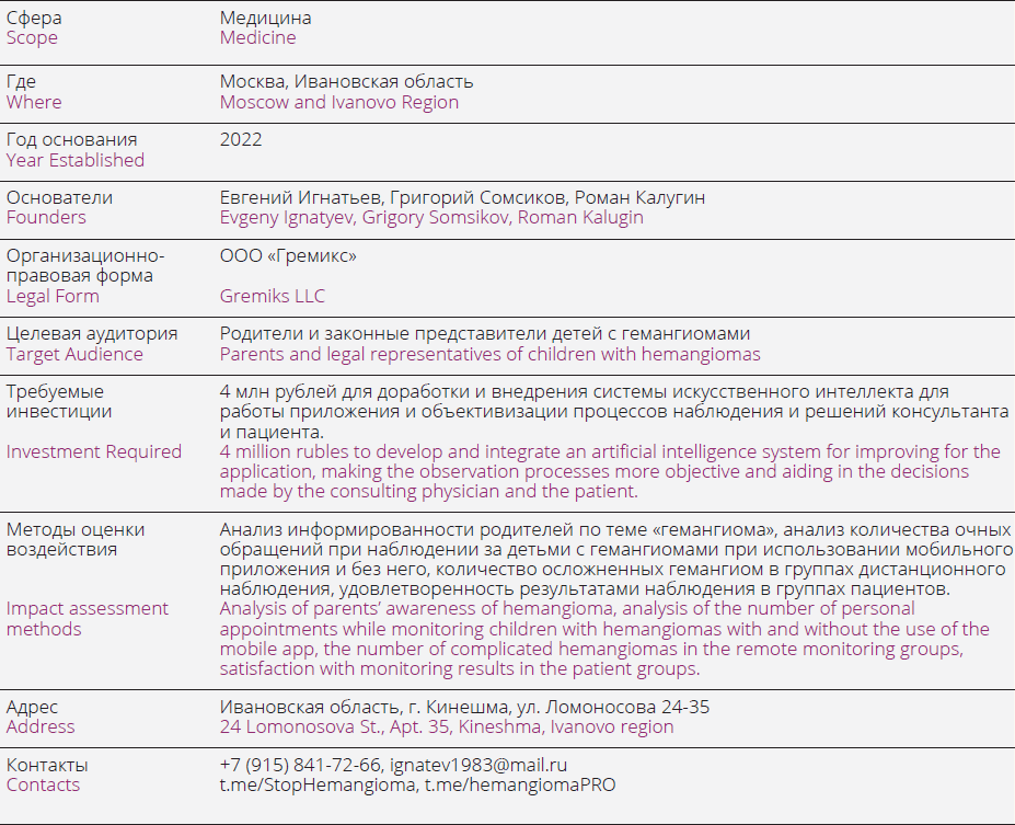 METHODS USED TO ADDRESS THE PROBLEMA team of doctors, programmers and engineers developed the Stop-Hemangioma project, which includes a mobile app and software package for monitoring children with hemangiomas. The project was launched with the support of the “Reach for Change” Foundation.