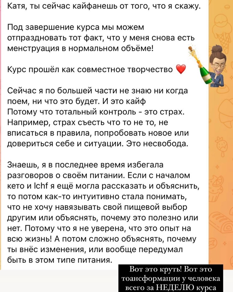 Как вы можете увидеть по отзывам о курсах осознанного питания, особенно про карнивор-питание, среди участниц очевидна тенденция к улучшению гормонального статуса, улучшению стрессоустойчивости, качества кожи, похудению и др.