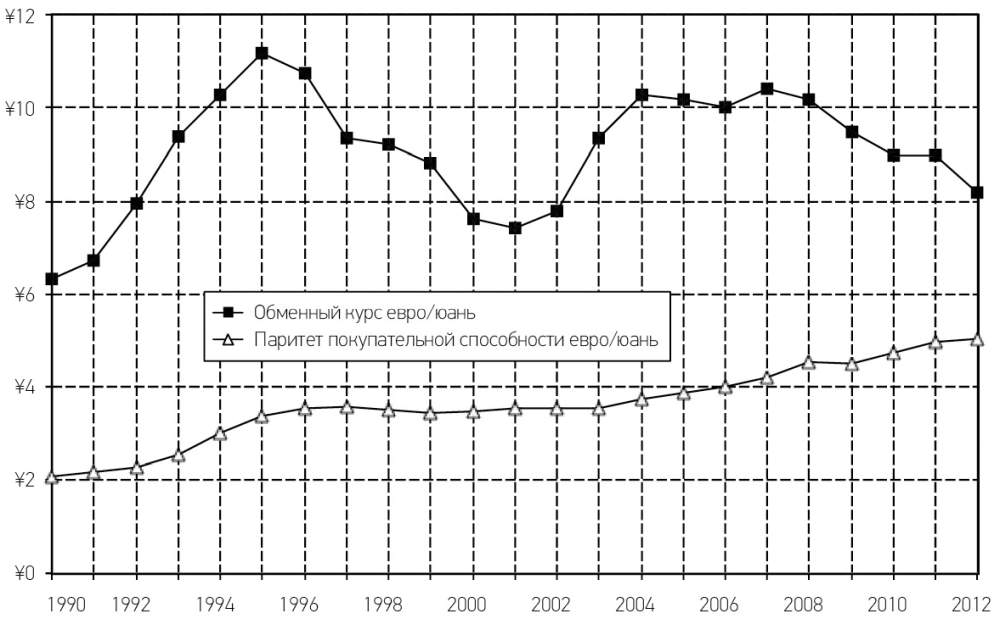 Примечание. В 2012 году евро стоил около восьми юаней по текущему обменному курсу, но пять юаней по паритету покупательной способности.
