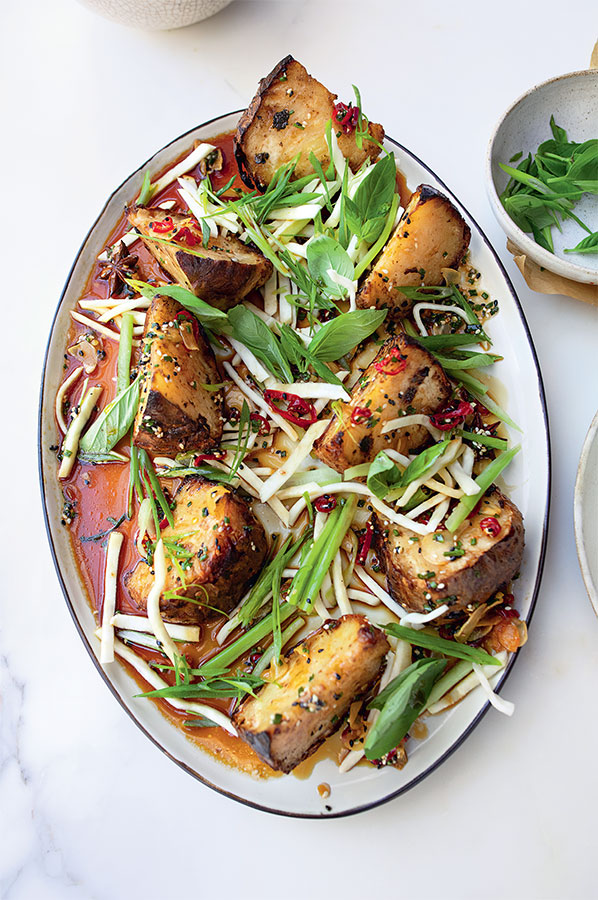 3. Выложите остальной маринад в большую миску вместе со стейками из брюквы и как следует перемешайте (легче всего это сделать, надев перчатки). Выложите стейки на большой застеленный пергаментом противень, оставив между ними достаточно места. Плотно накройте фольгой и запекайте 1 час 20 минут. Снимите фольгу, переключите духовку на режим гриля и обжаривайте стейки 3–4 минуты до готовности брюквы и появления золотисто-коричневой корочки.