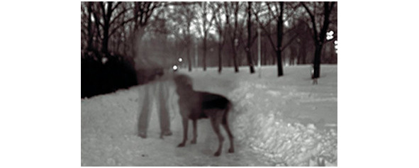 На фото собака на вечерней прогулке прекрасно видит подошедшего к ней призрака.