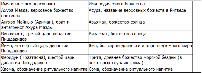 Таблица 1. Лингвистические связи между иранскими персонажами и ведическими божествами.
