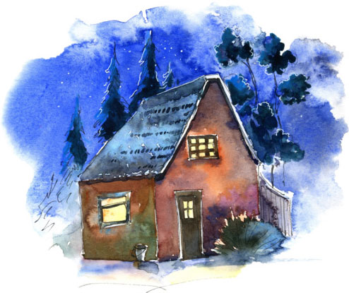 Ночь. Верхушки елей на фоне звёздного неба. Млечный путь. Падающие звезды. Звуки ночи. Червячок ползет. По краю крыши.